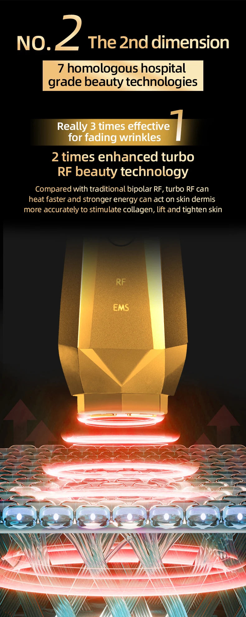 - RF multi-polaire & EMS : relance le collagène, lifte, densifie.